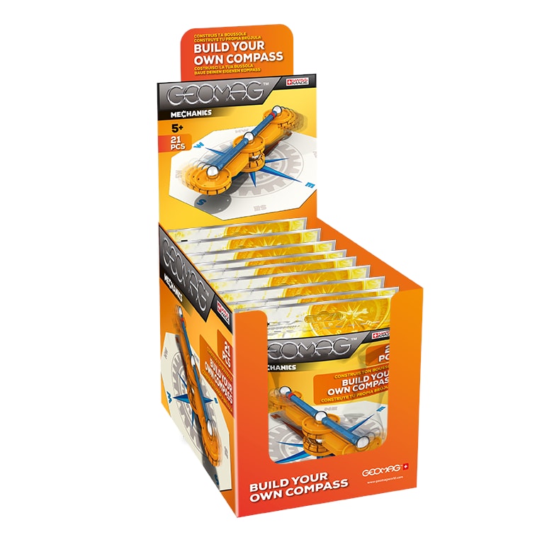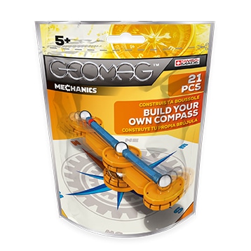 Building sets Geomag are fun and creative. The magnetic strength hidden in its pieces can entertain both children and adults. They improve children’s fine motor skills, teach them to recognise shapes and colours. They also improve their ability to concentrate. With the building set Geomag Mechanics Compass, 21 parts, you will learn about the effects of the Earth’s magnetic field and learn to determine the cardinal points in a playful way. This magnetic building set is therefore also suitable as a school tool.