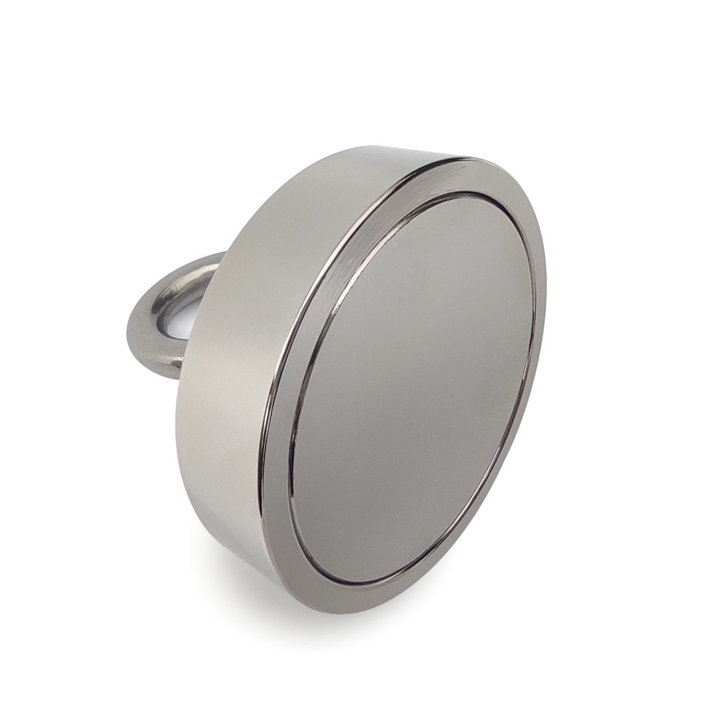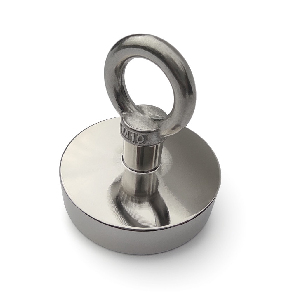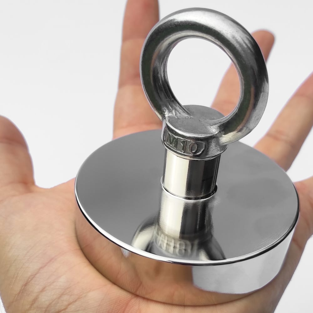Extremely powerful neodymium magnet designed specifically for treasure hunters. The magnet has an internal thread with a screwed-in eyebolt for attaching a rope. The height of the wider circular part of the magnet is 18 mm. Together with the threaded outlet to the eyebolt (without eyebolt height) the magnet has a height of 34 mm.