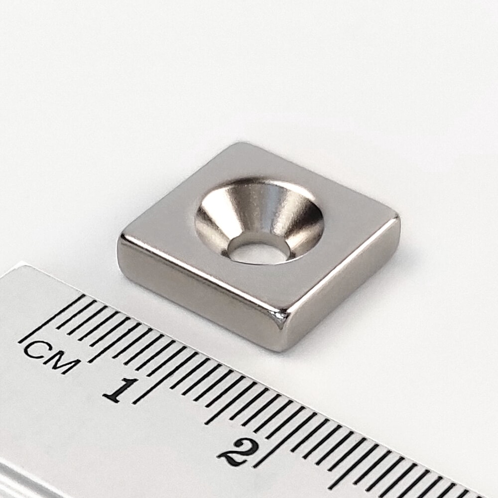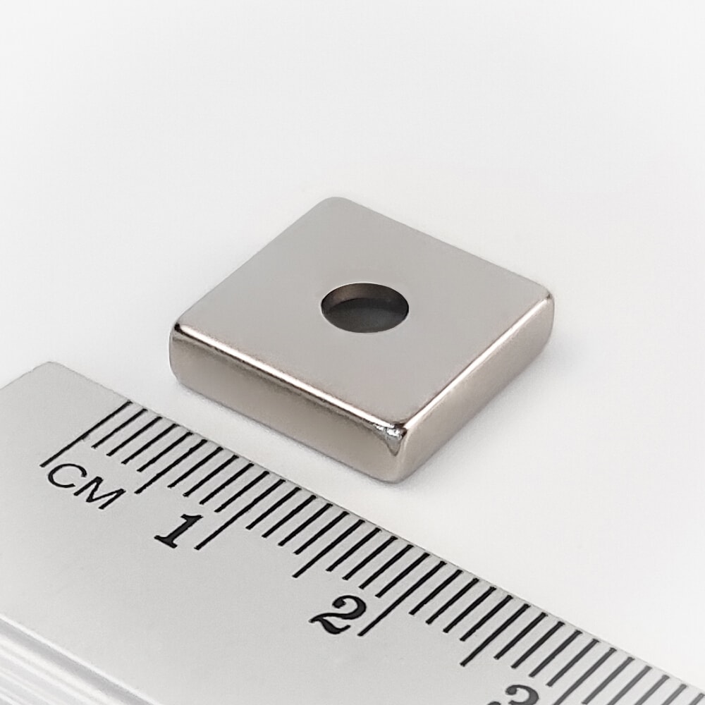 Neodymium magnet, block, 15×15×4 mm, with hole M4 (south pole on the countersunk side) – N38