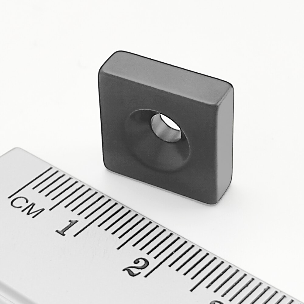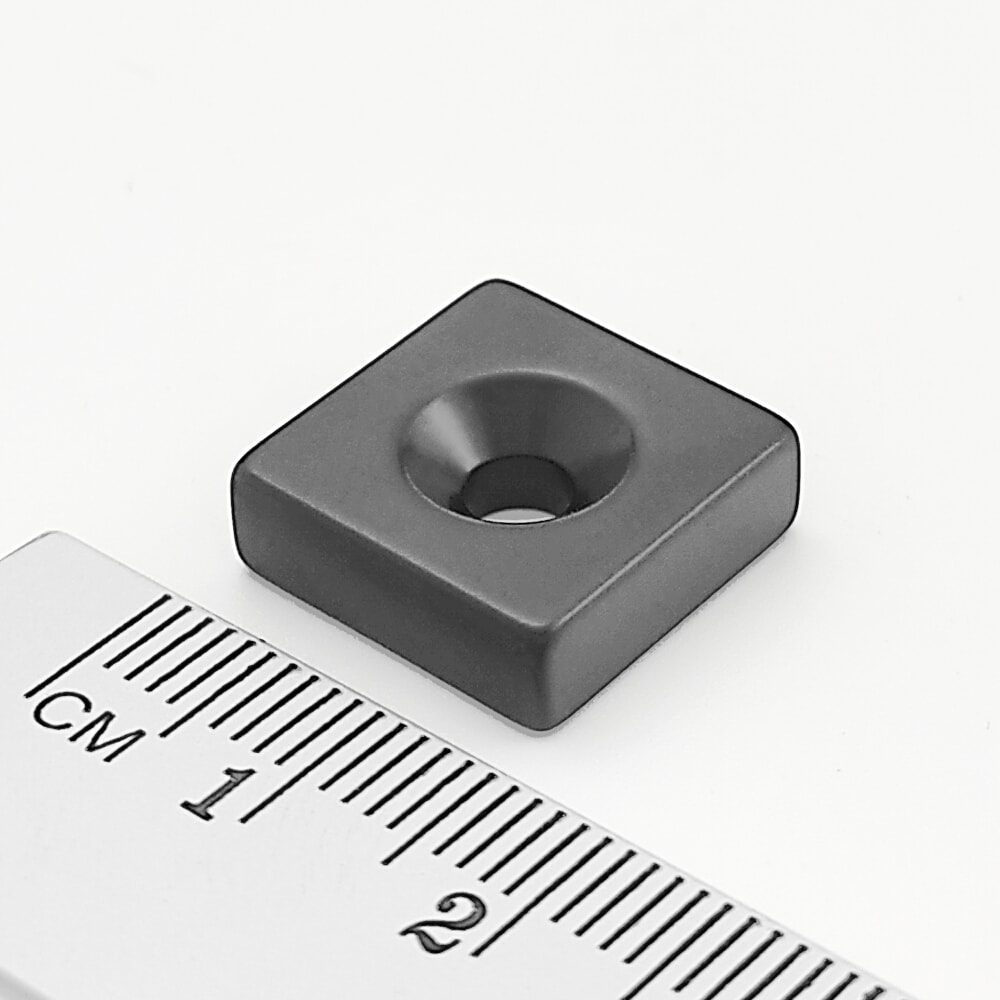Neodymium magnet, block, 15×15×5 mm, with hole M4 (north pole on the countersunk side) epoxy – N42
