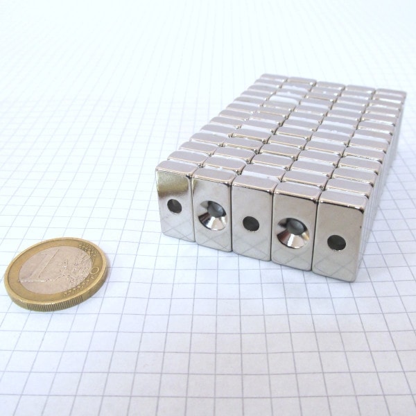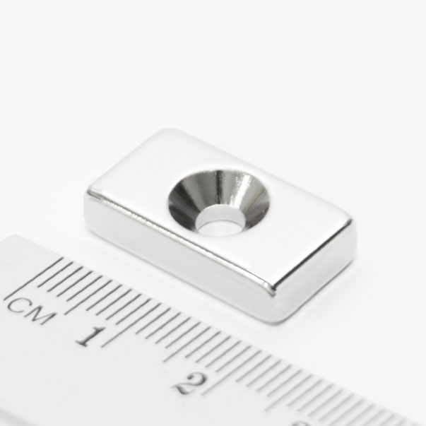 Neodymium magnet, block, 20×10×5 mm, with hole M4 (north pole on the countersunk side) – N38