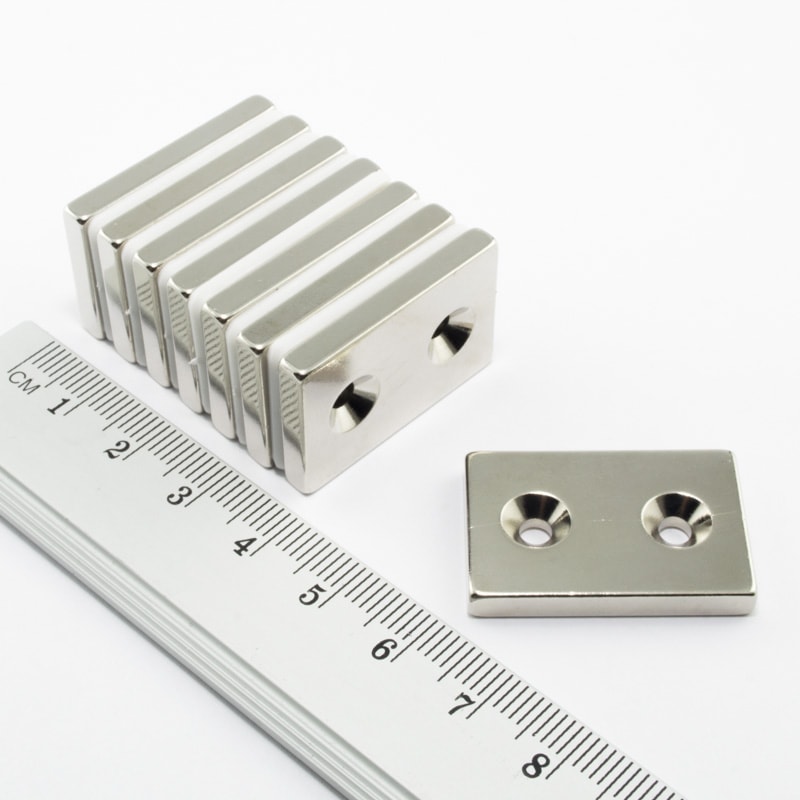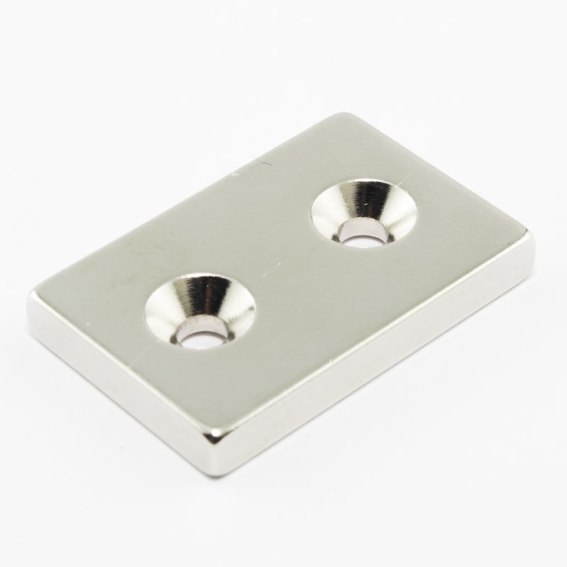 Neodymium magnet, block, 30×20×4 mm, with 2 holes M3 (north pole on the countersunk side) – N38