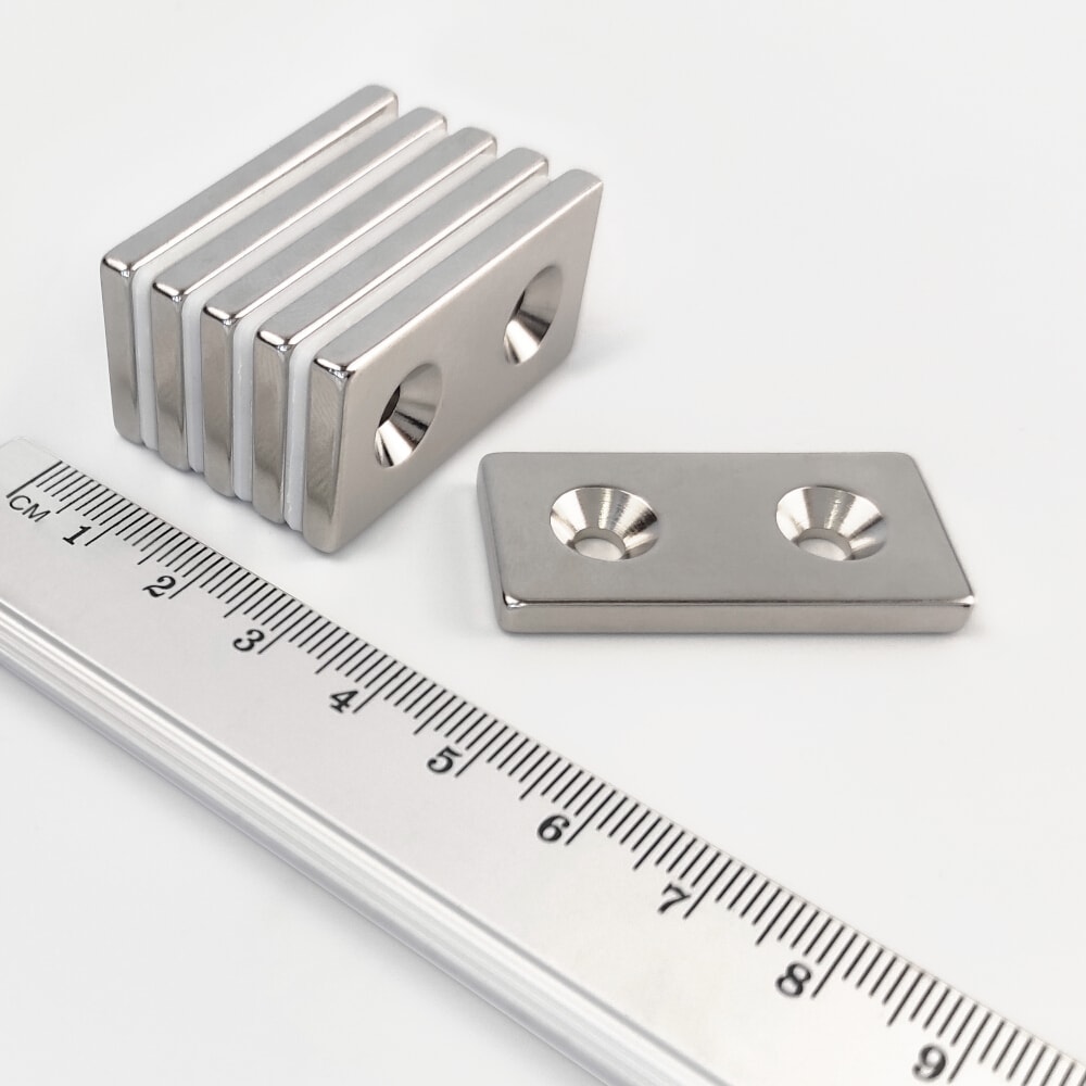 Neodymium magnet, block, 40×20×4 mm, with 2 holes M4 (south pole on the countersunk side) – N38