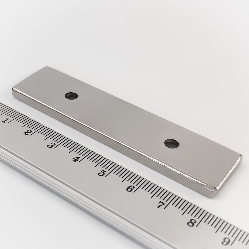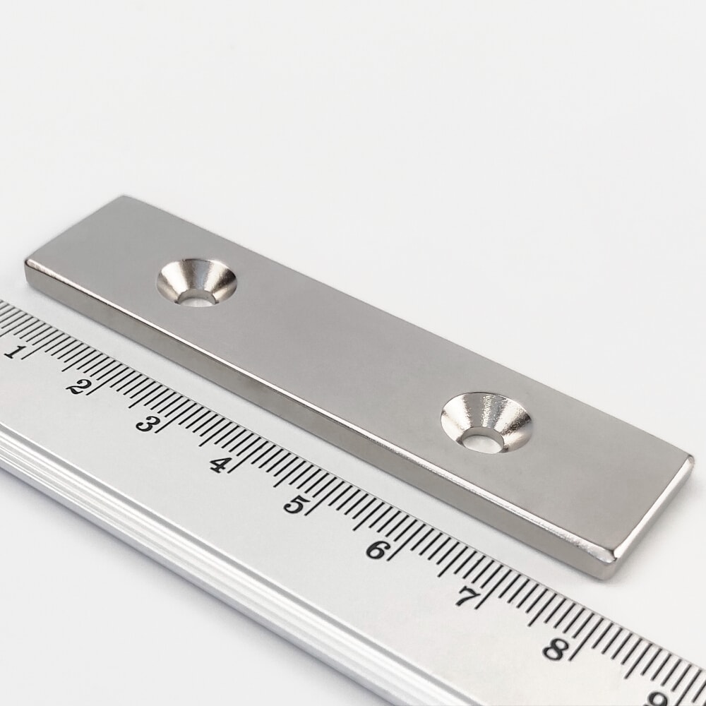 Neodymium magnet, block, 80×20×4 mm, with 2 holes M4 (south pole on the countersunk side) – N38