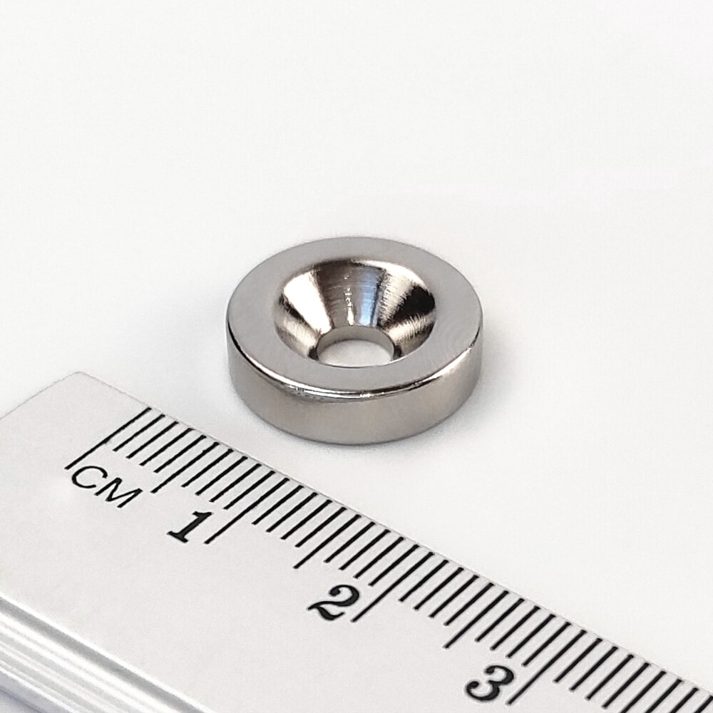 Neodymium magnet, disc, 15×4 mm, with hole M4 (north pole on the countersunk side) – N38