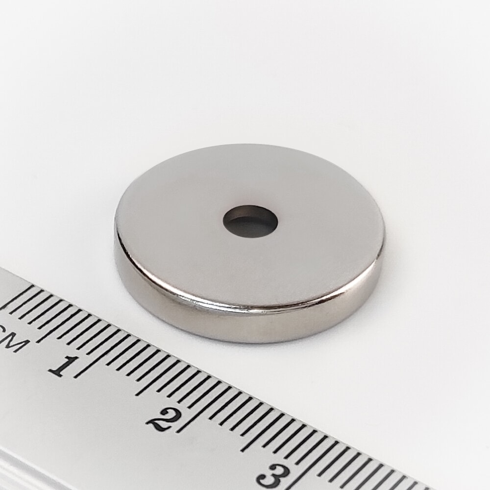 Neodymium magnet, disc, 23×4 mm, with hole M4 (north pole on the countersunk side) – N38
