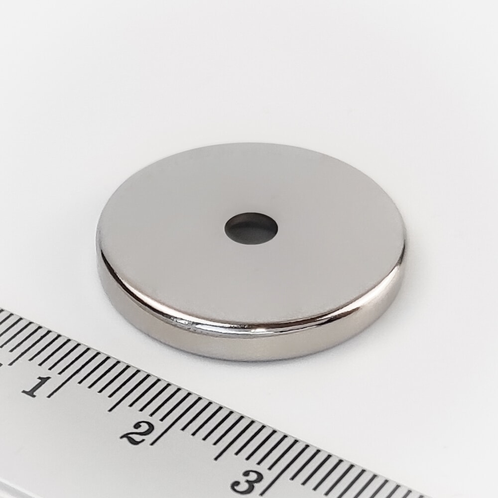 Neodymium magnet, disc, 27×4 mm, with hole M4 (north pole on the countersunk side) – N38