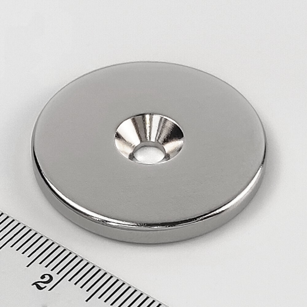 Neodymium magnet, disc, 34×4 mm, with hole M4 (north pole on the countersunk side) – N38