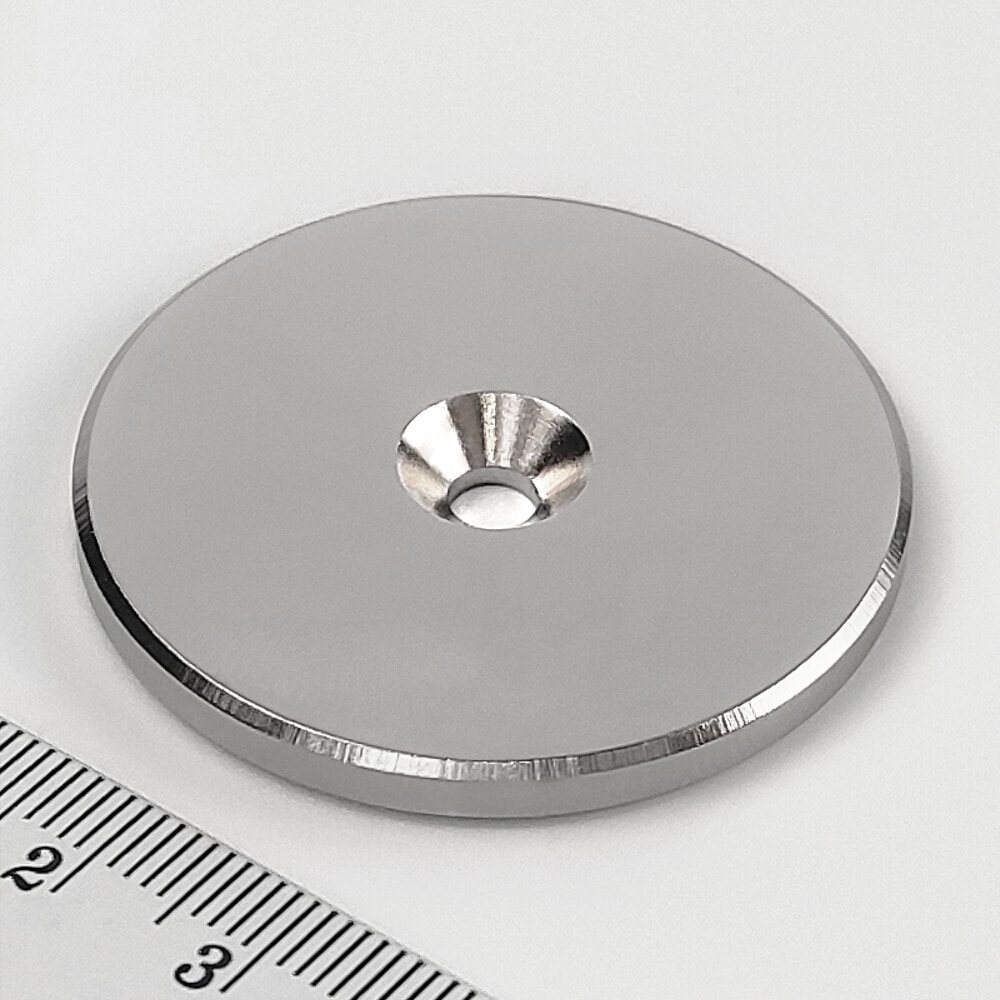 Neodymium magnet, disc, 42×4 mm, with hole M4 (north pole on the countersunk side) – N38