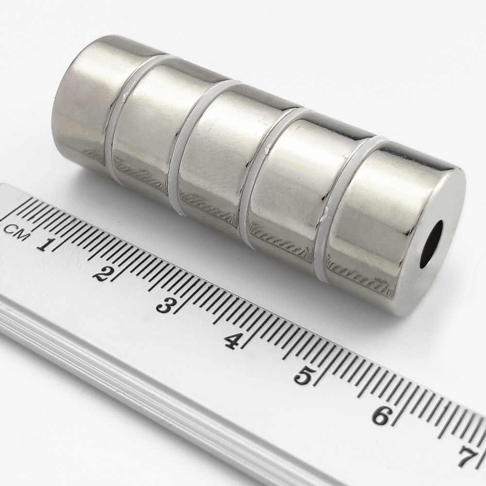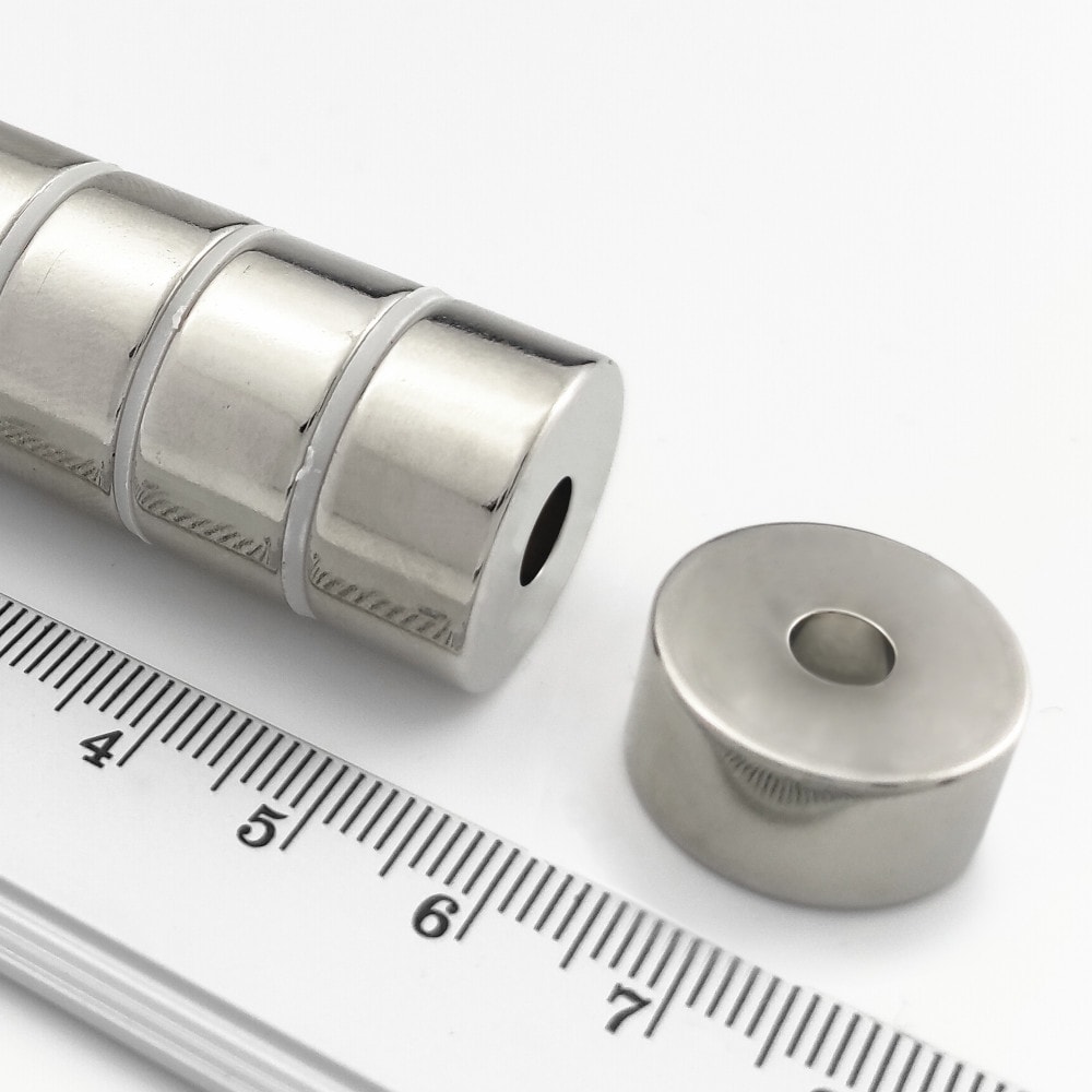 Neodymium magnet, disc with centre hole with diameter of 6 mm.