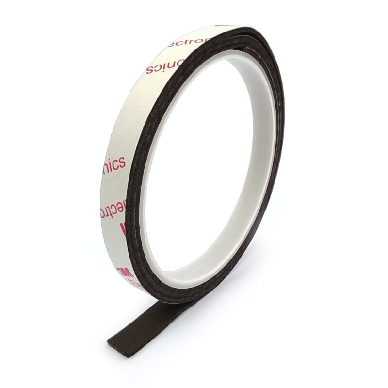 Magnetic adhesive tape has a magnetic and adhesive side. The magnetic side is attached to the metal. On the adhesive side is 3M glue, which is designed for a wide variety of materials and applications that require strong bonds. On the magnetic side, the north and south poles alternate every 5 millimetres.