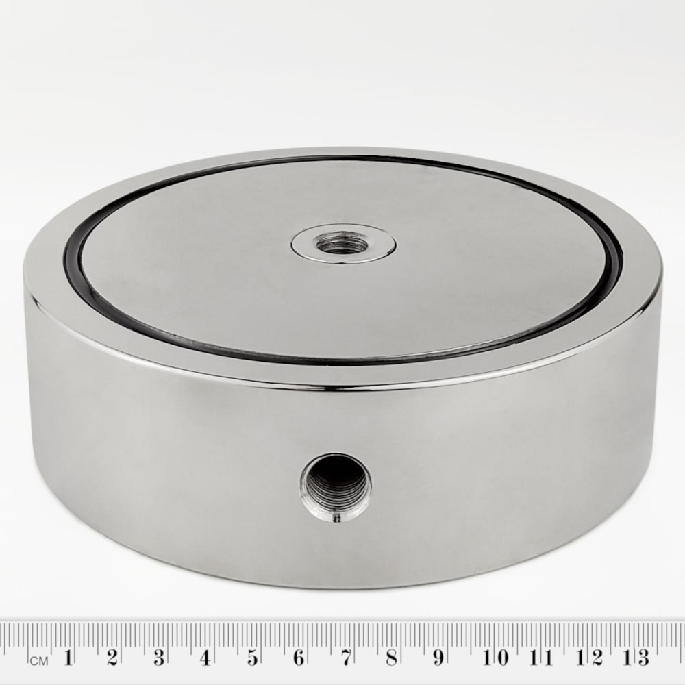 Unlike our other threaded magnets, this magnet attracts from both sides. There are two threads in the magnet for the M12 screw: one runs through entire magnet in the direction of the axis and the other runs from the side to the centre of the magnet.