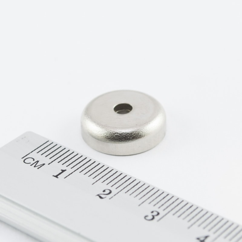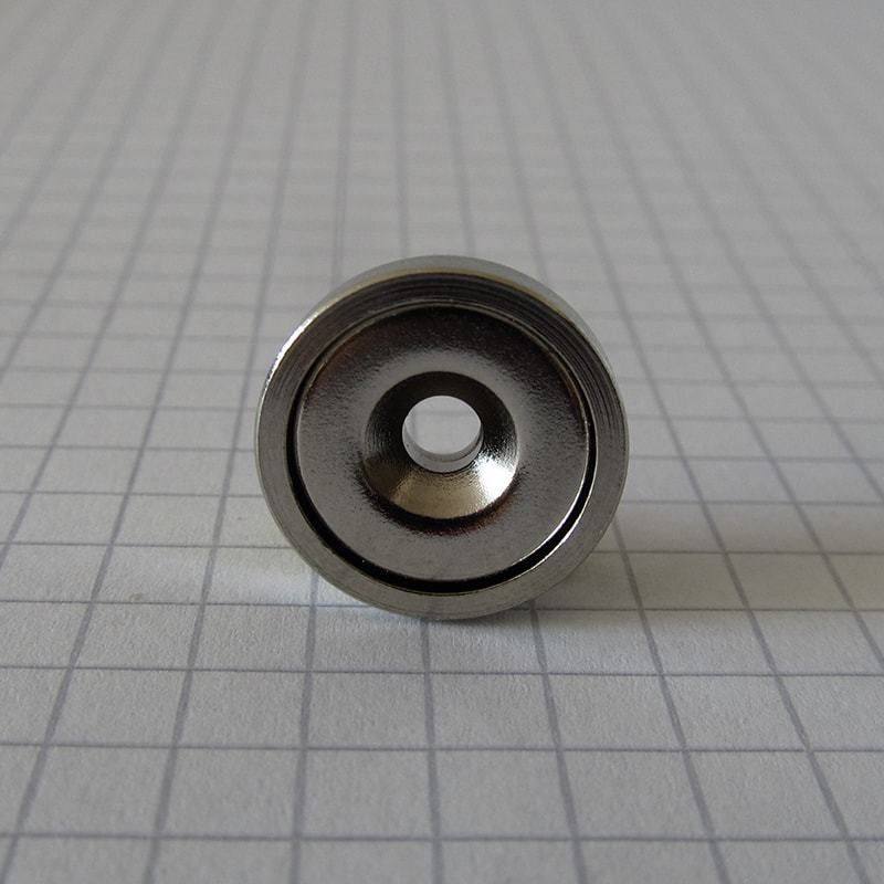 Magnetic mount with M3 screw hole in the centre. The mount consists of a neodymium magnet and a steel cylinder concentrating all the magnetic force into a small space on one side of the magnet. Thanks to this, the mount can hold even very heavy objects and is suitable as both a vertical and horizontal holder. Since all the magnetism is concentrated on the surface of the active side of the mount, the force drops off sharply with distance and the mounts have almost no effect on more distant objects. The back of the mount is not magnetic.