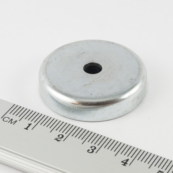 Magnetic mount with hole in the centre for M5 screw. The mount consists of a ferrite magnet and a steel cylinder, which concentrates the entire force of the magnet into a small space on one side of the magnet. Thanks to this, the mount can hold even very heavy objects and is suitable as both a vertical and horizontal magnetic holder. Since all the magnetism is concentrated on the surface of the active side of the mount, the force drops off sharply with distance and the mounts have almost no effect on more distant objects. The back of the mount is not magnetic.