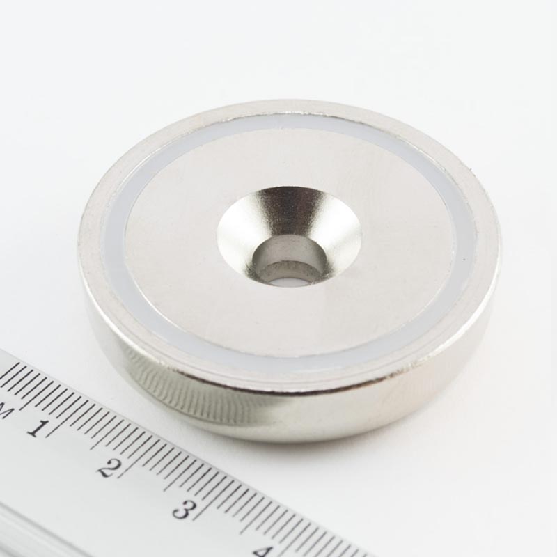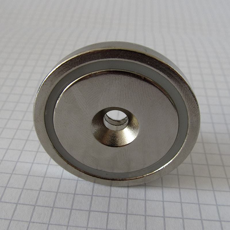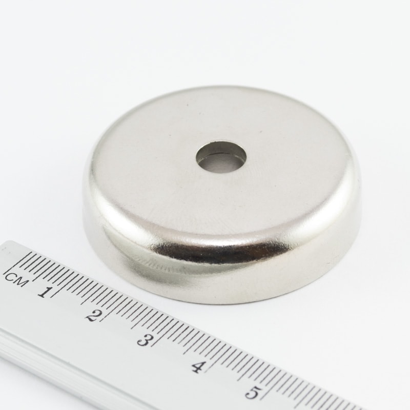 Magnetic mount with M8 screw hole in centre. The mount consists of a neodymium magnet and a steel cylinder concentrating all the magnetic force into a small space on one side of the magnet. Thanks to this, the mount can hold even very heavy objects and is suitable as both a vertical and horizontal holder. Since all the magnetism is concentrated on the surface of the active side of the mount, the force drops off sharply with distance and the mounts have almost no effect on more distant objects. The back of the mount is not magnetic.