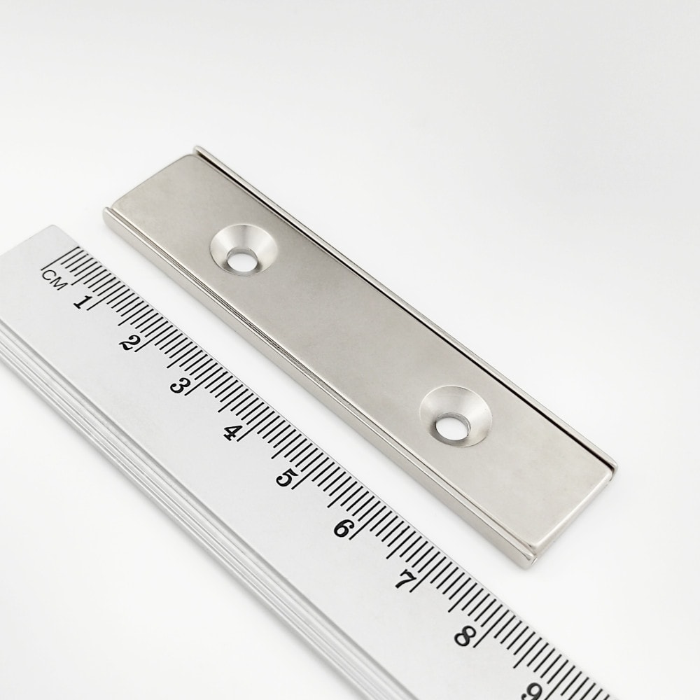Magnetic mount with holes for M4 screw. The mount consists of a neodymium magnet and a steel pot that concentrates the magnetic force into a small space on one side of the magnet. Thanks to this, the mount can also hold heavier objects and is suitable as both a vertical and horizontal holder. Since all the magnetism is concentrated on the surface of the active side of the mount, the force drops off sharply with distance and the mounts have almost no effect on more distant objects. The back of the mount is only very weakly magnetic.