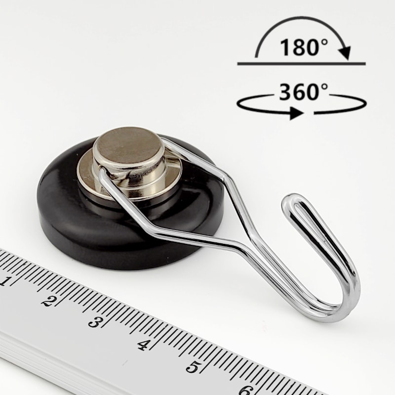 Strong neodymium magnet in 36 mm diameter metal pot with swivel hook. The hook can be rotated 360° on its axis, it moves freely forward and backward within a range of 180°.